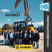 „Mit HYDREMA gewinnen wir einen starken Partner, dessen Maschinenkonzept perfekt zu unserer Philosophie passt“, sagt Geschäftsführer Michael Ellinger. „Wir verstehen uns als Spezialist für Baumaschinen mit Sonderlösungen und hochwertigen Spezial-Anbaugeräten, wie zum Beispiel der in diesem Jahr eingeführten EMB-RAM Seitengrifframme. Der Bagger ist für uns mehr als nur ein Erdbewegungsgerät – er ist ein vielseitiger Geräteträger. Genau hier überzeugt HYDREMA mit seiner Kombination aus Kompaktheit, Kraft und intelligenter Hydraulik.“